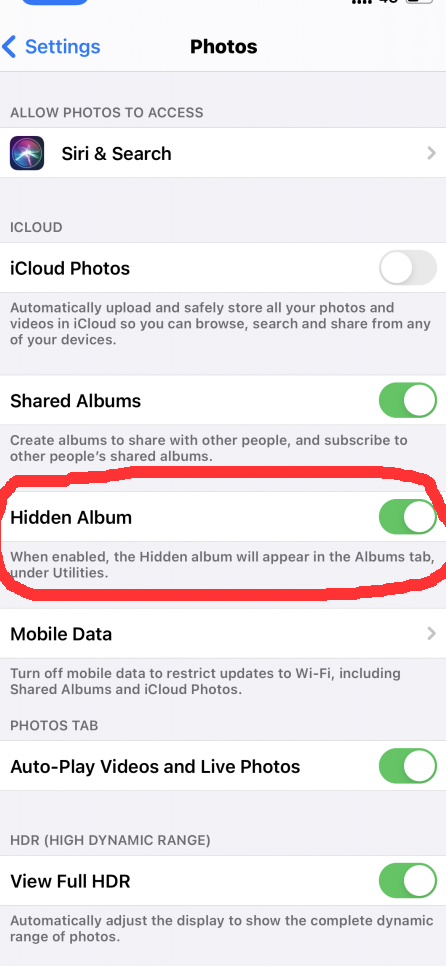 Scroll near the bottom, and disable the toggle for Hidden Album.